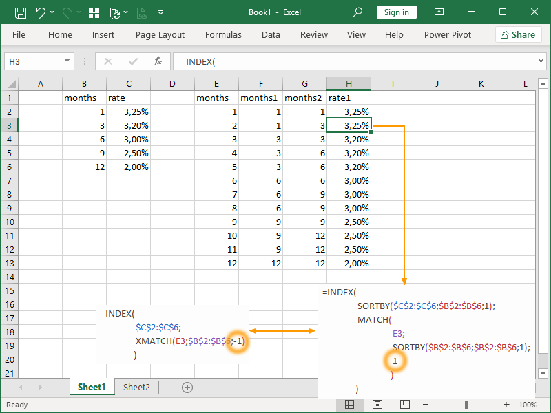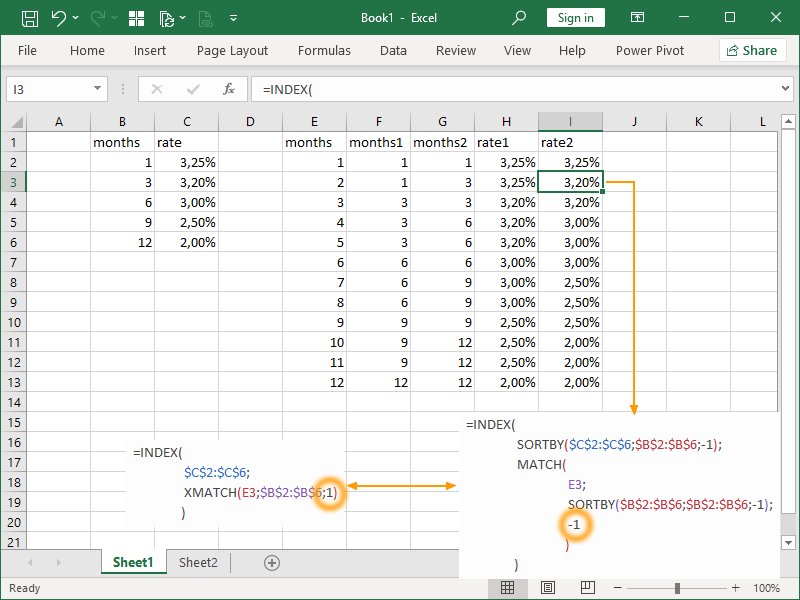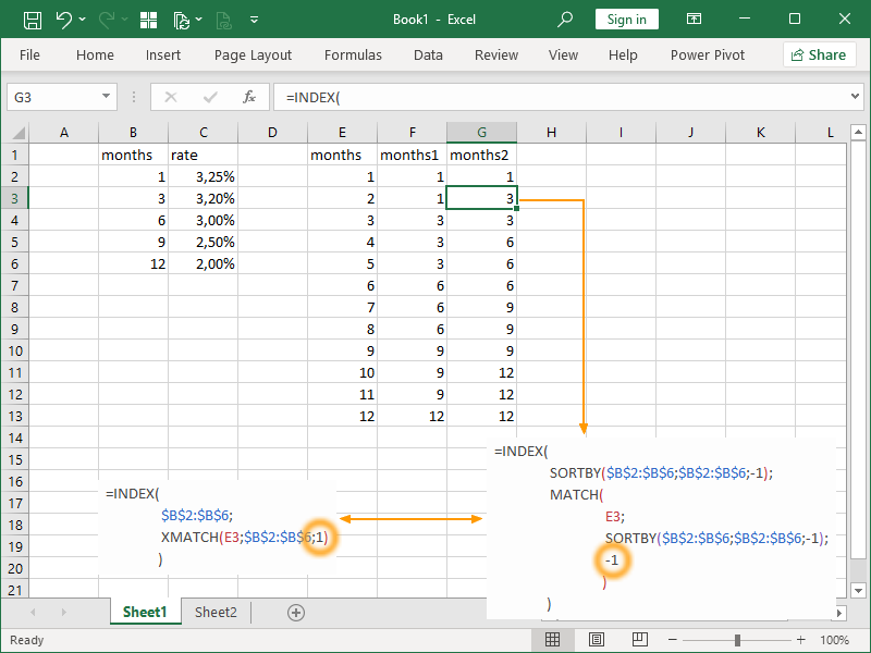 However, that may not always be the case. In the following example, we will also use the SORTBY function in order to sort our lookup array and our return array. Both arrays have to be sorted by the same sorting array: